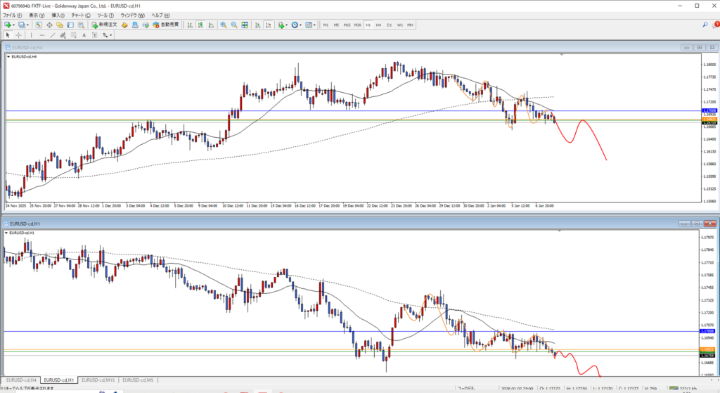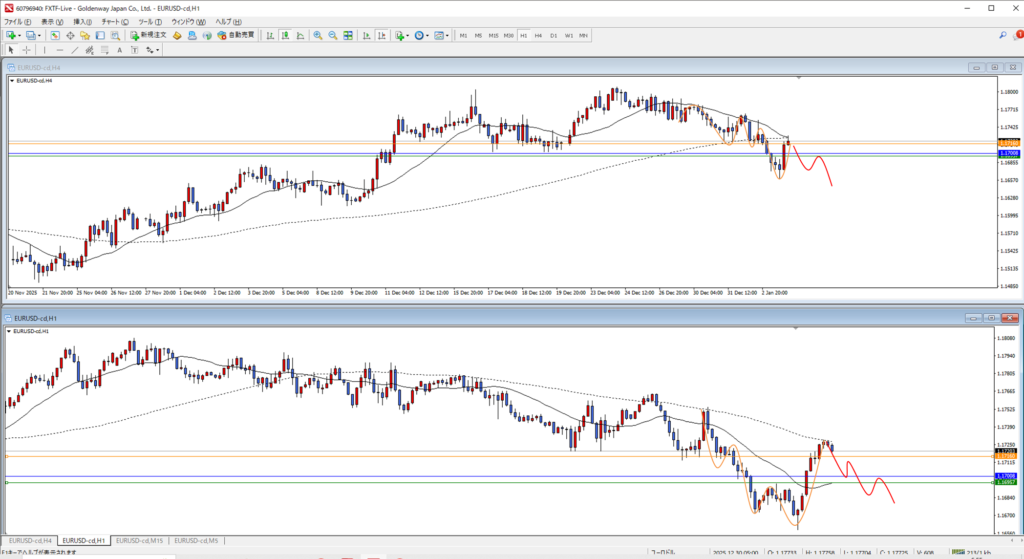 4Hオレンジまで戻って、MAがいい感じに頭を押さえてくれたら入りたい。今は4Hで足が早すぎるので、1Hでいい形になってもあまり入りたくない。