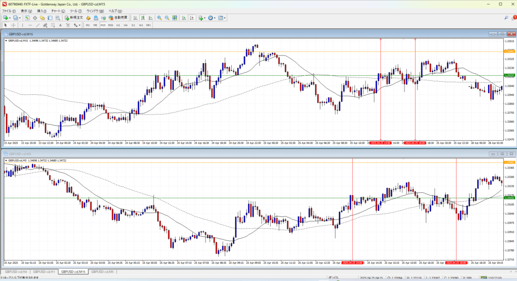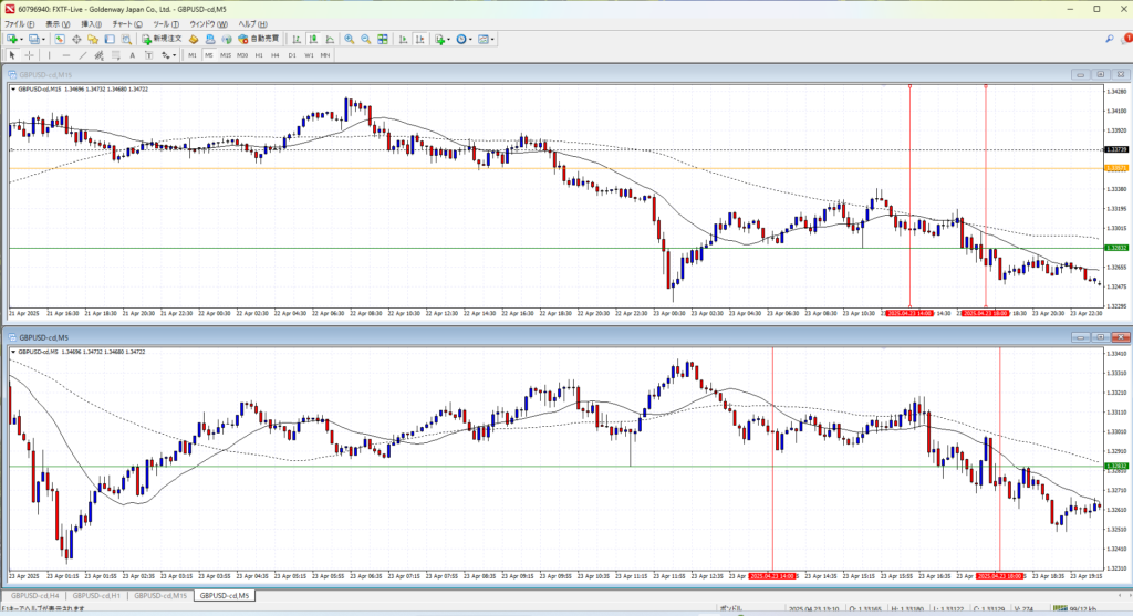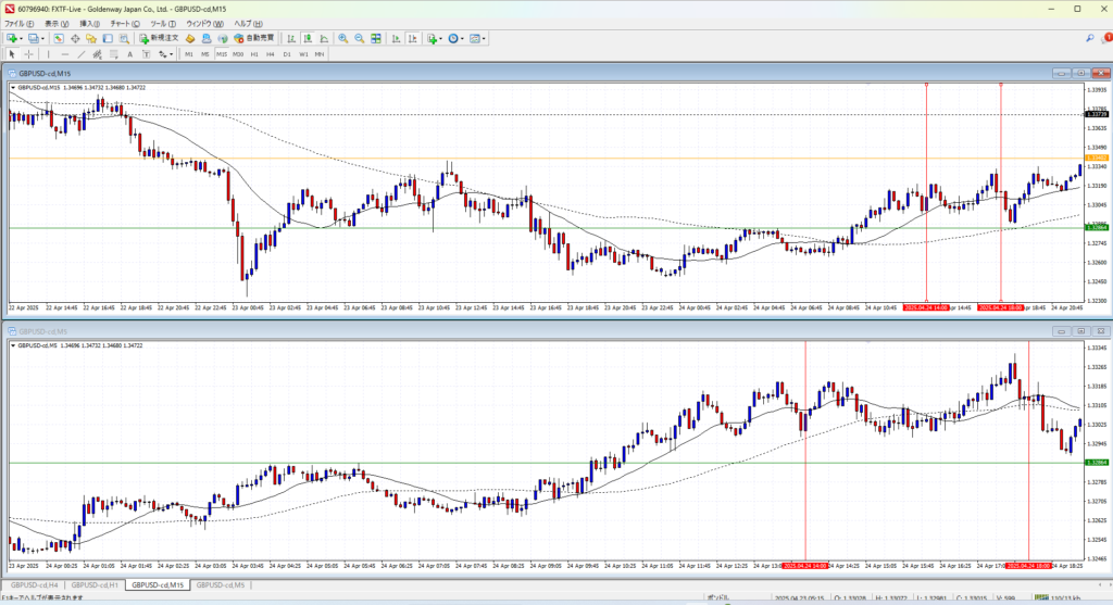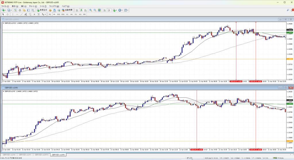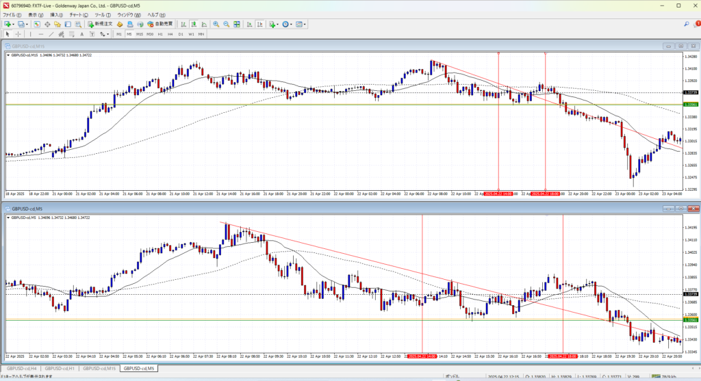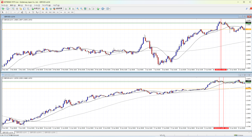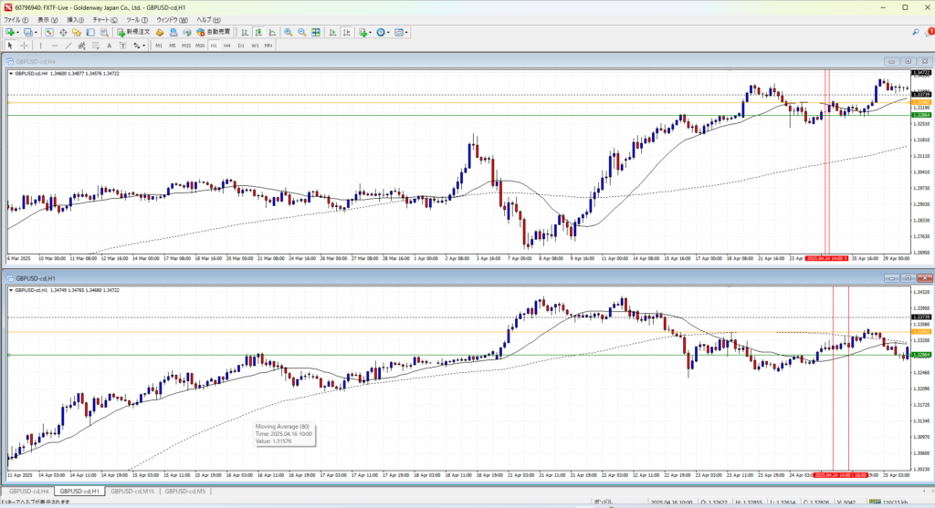 4Hで伸びすぎか、というところの後のさらに一伸びしたところ。さすがにここからのトレンドフォローは負け続けるか。4Hの調整場面で1Hのトレンドフォローは無理がある。